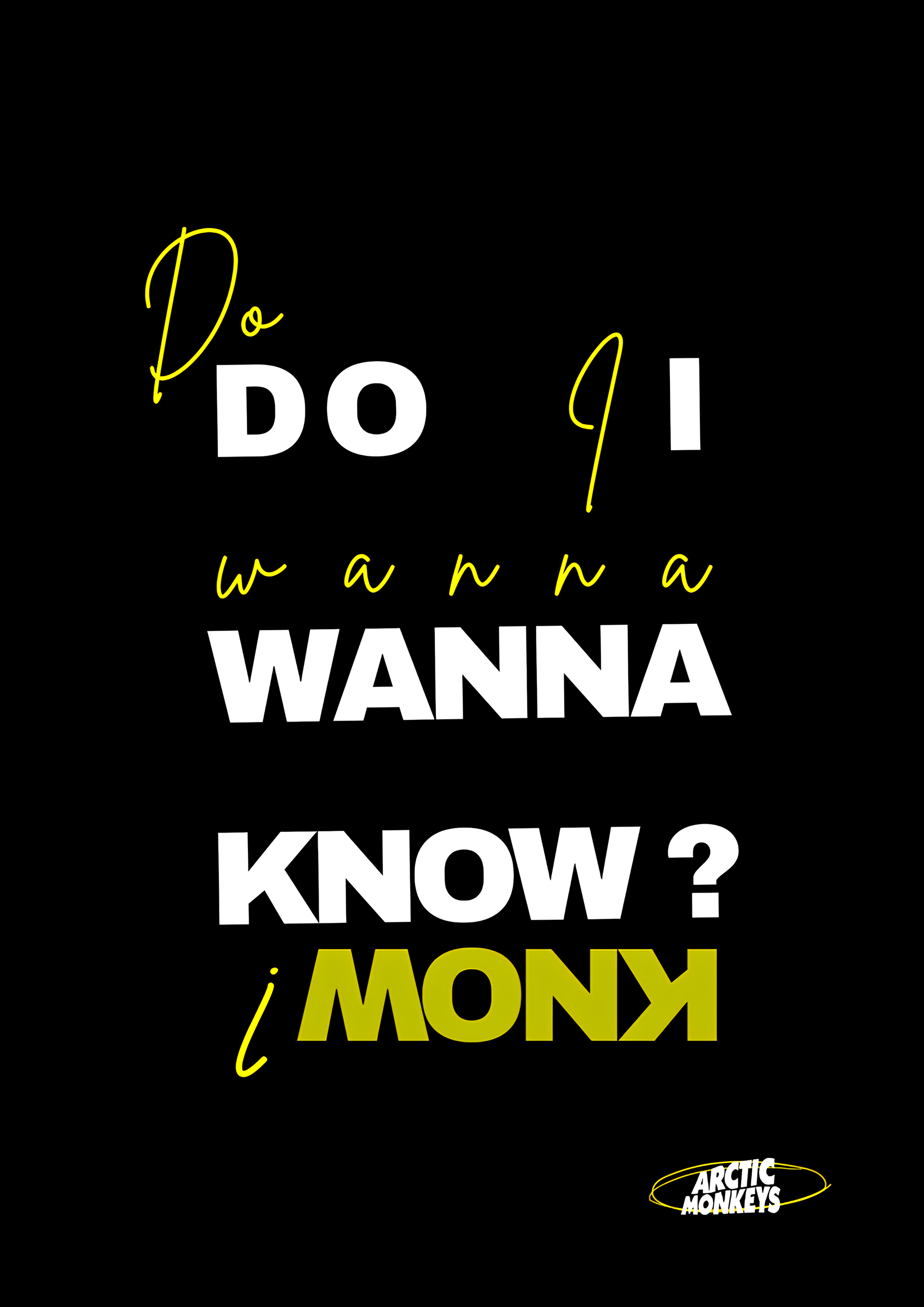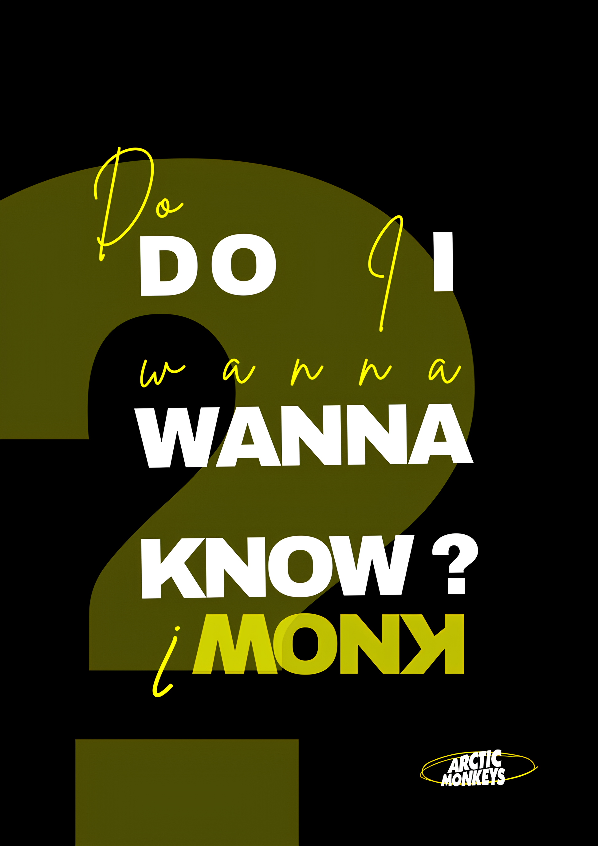 - Artic Monkeys with dark black & yellow background, "Do I Wanna Know" lyrics & little logo